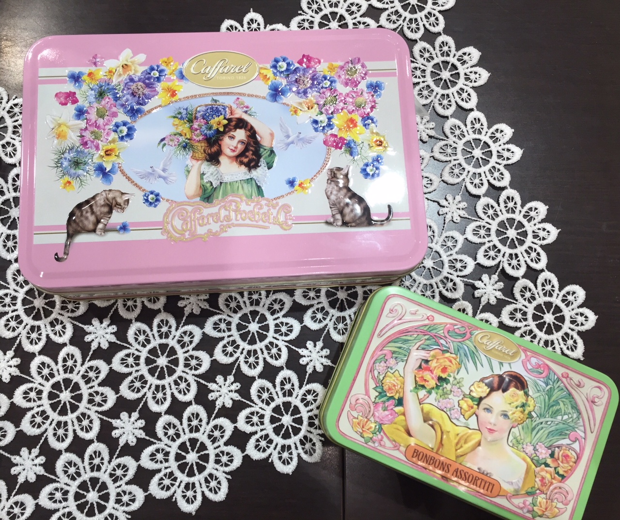 ピンク色の缶にはチョコレート、緑色の缶はキャンディーが入っています。