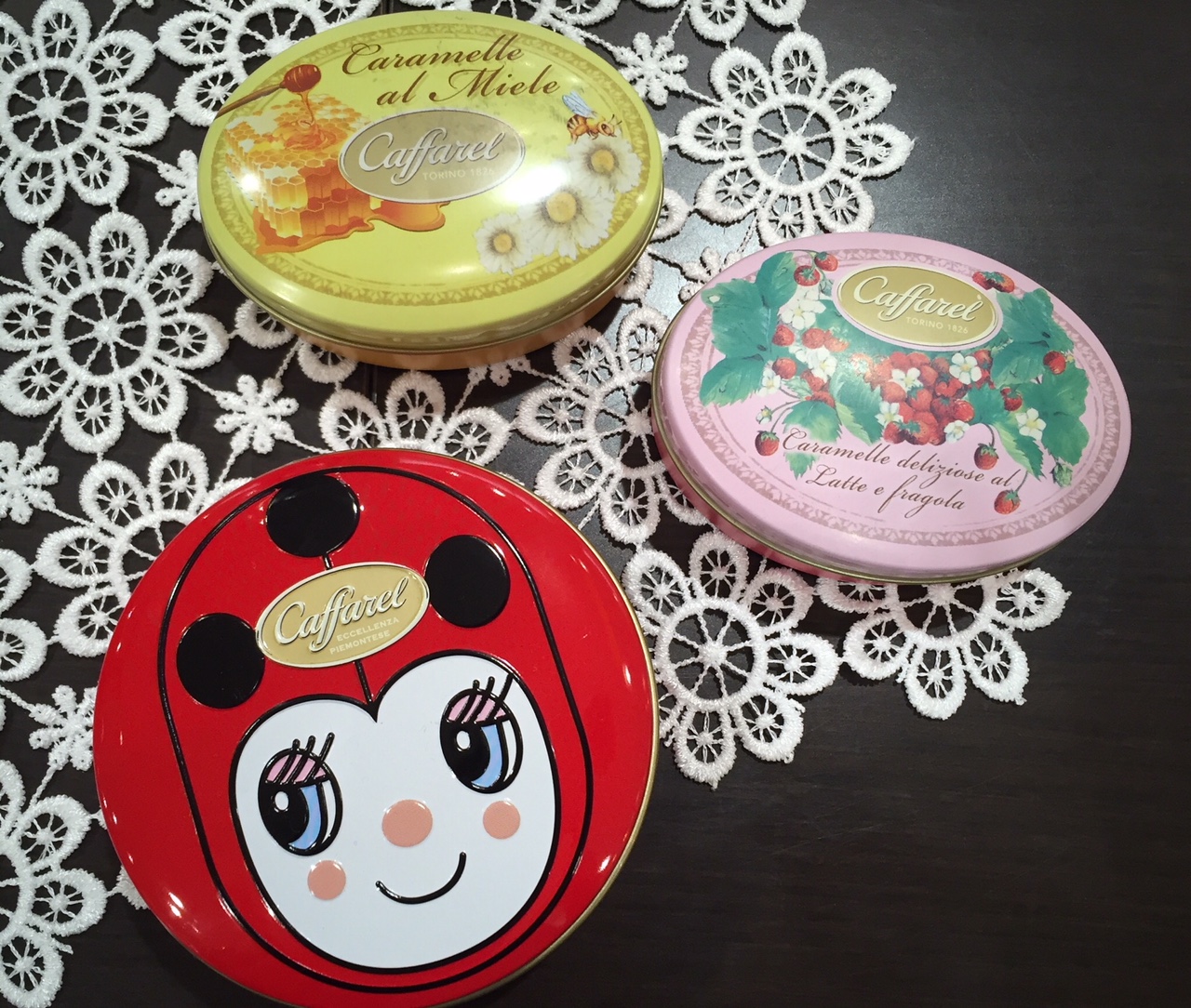 ピンク色と黄色の缶にはキャンディー、ビビットな赤色のてんとう虫デザインの缶にはチョコレートが入っています。