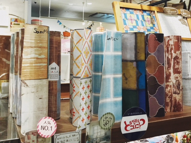 左端のペイントウッド、真ん中のカラフルな四角のカラフルなヴィンテージタイル柄が紹介され、当店では連日大人気!! 他にも可愛い柄が揃っていますよ◎