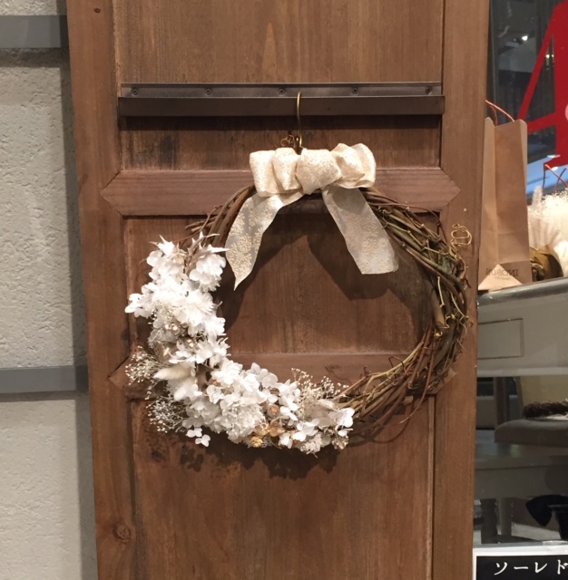 白いブリザーブドフラワーをベースに木の実などを付けて可愛いリースが出来ました。