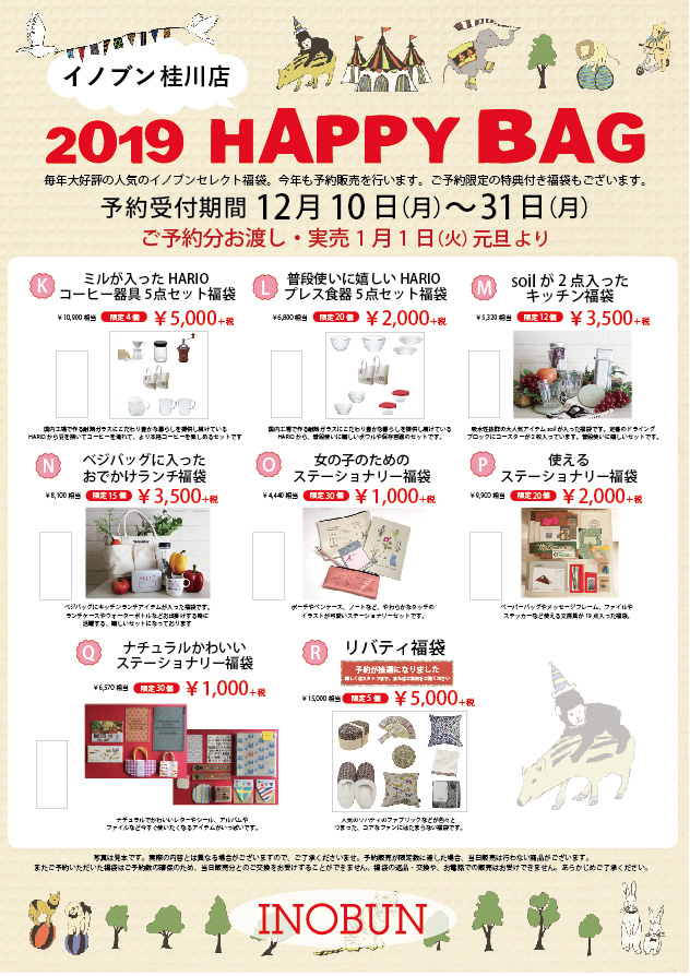 2019年は、「森のサーカス」をテーマにしたデザインのイノブンオリジナルエコバッグに入った福袋も登場し、盛りだくさんの内容となっております♪