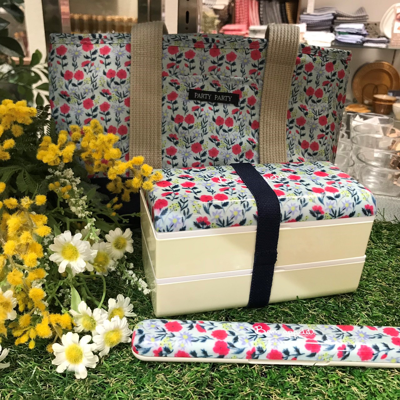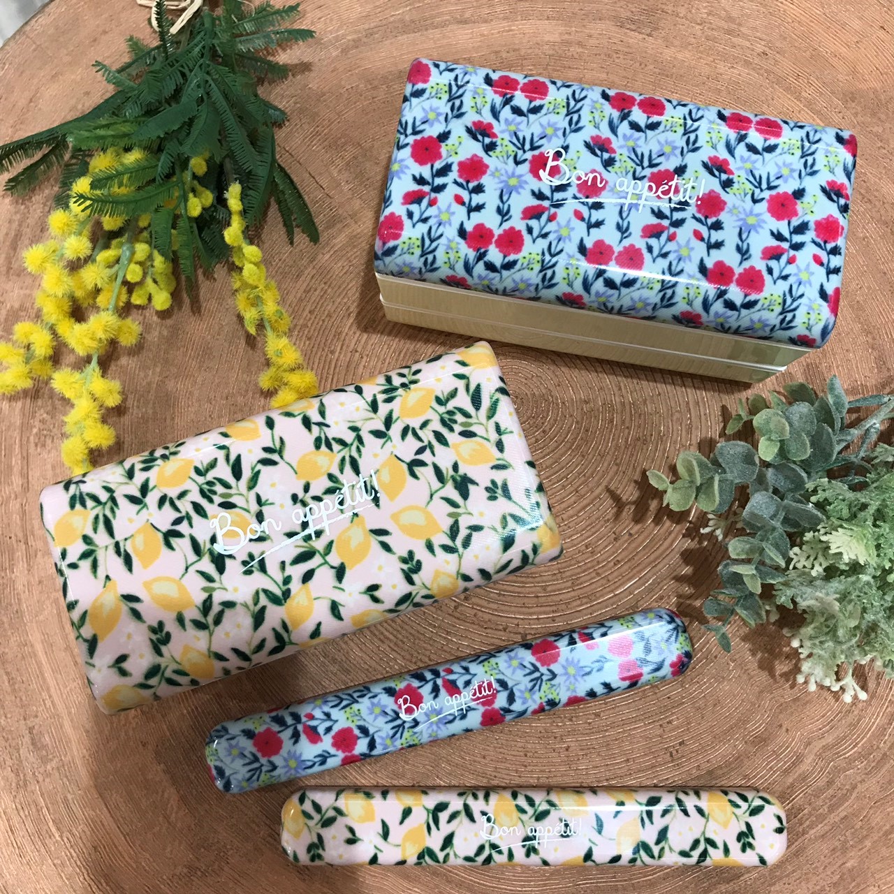お弁当のフタにお花やレモンのテキスタイルを閉じ込めました。