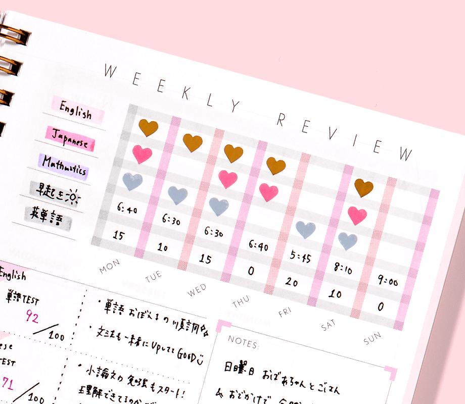 1週間の振り返りページもあるので自分は今どの科目が得意・不得意なのかをしっかりと把握し、次の勉強へと繋げやすい優れものです!!