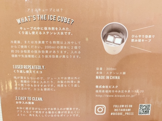 タンブラーと繰り返し使えるエコなアイスキューブがセットになっております。