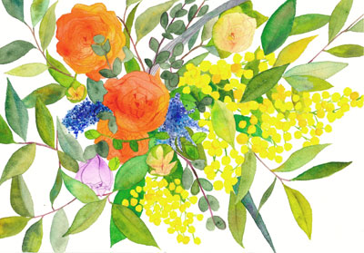 目の前にある花を描くというよりかは、独自の世界観でのブーケを描くことが多い。最近は原画の展示販売だけでなく、ボタニカル柄を生かしたオリジナルグッズやスマホケースなども販売している。