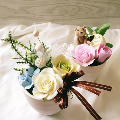 お好みの色のクレイ(粘土)でバラを作り、マカロン又はシリコンモールドを使ってクレイでアレンジパーツを作り、リボンやパール、アーティフィシャル等、また完成品のクレイ製クマちゃんや小花も用いて自由にアレンジをお楽しみいただけます。