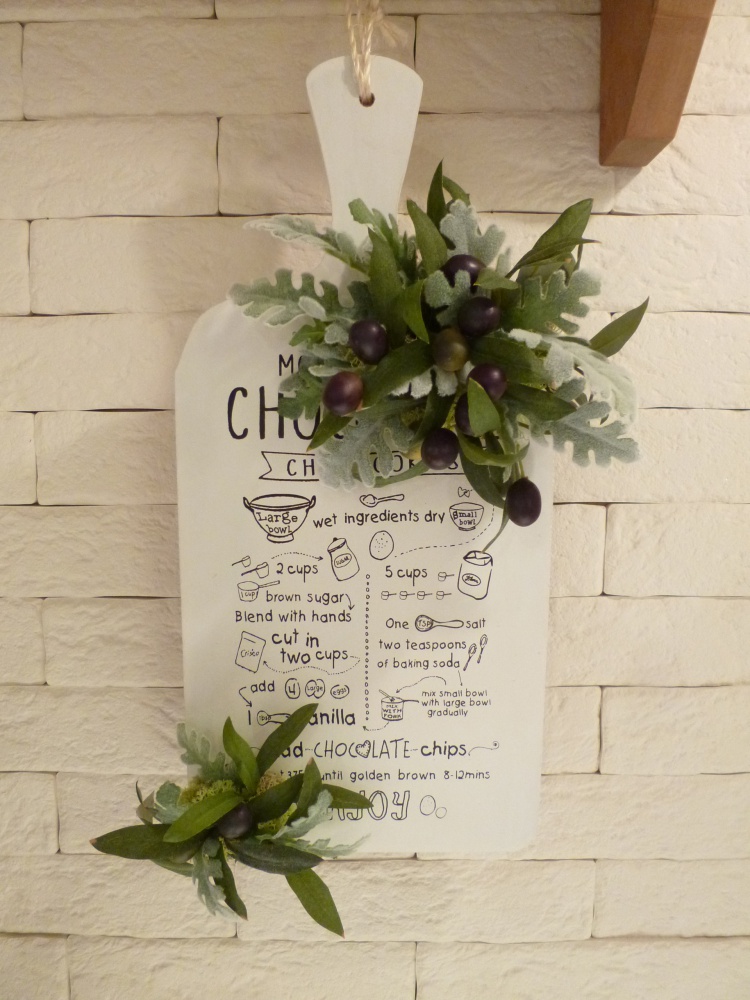 カッティングボード風のオシャレなボードに、アーティフィシャルフラワーを使って、