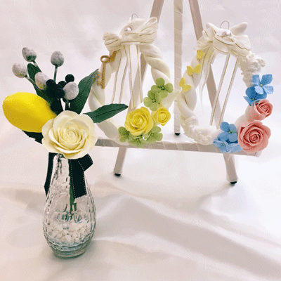 お花もリースもソフトクレイで作るワークショップです。蝶々やフェザー(羽)、リーフ(葉)、アルファベット型など、クレイで型抜きして可愛くアレンジ。ソフトクレイなので乾くととても軽く飾りやすい仕上がりです。