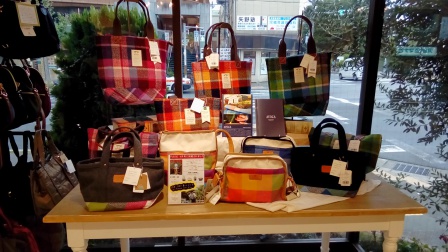 左からチェリー色の大きなトートバッグ、そして右がメープル色の少し小さめのトートバッグとなっております。どのような用途にも合うサイズのカバンがございます。