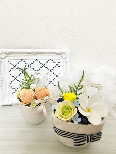数種類の花器の中から1つ選んで、お好みの色のクレイ(粘土)でバラ2輪と、夏らしいトロピカルフラワー『プルメリア』をお作りいただきます。 リボンやパール、アーティフィシャル等、また完成品のクレイ製パーツも用いて自由にアレンジが楽しめるワークです。
