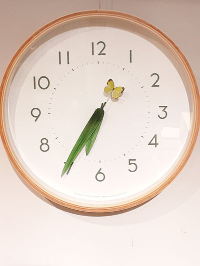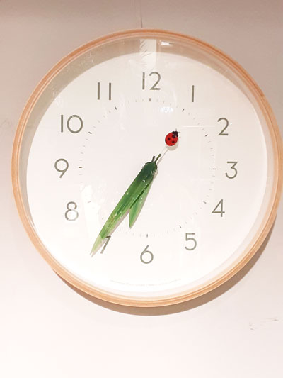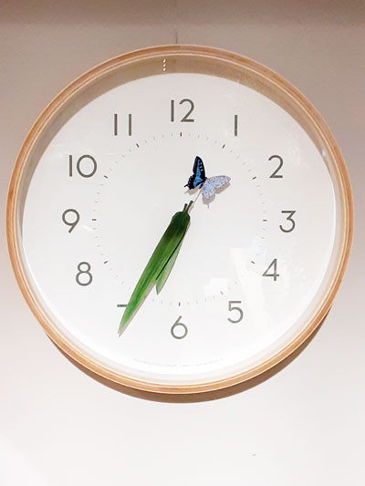 1時間に一度、分針と時針が交差するときに昆虫が葉っぱの上で羽を休める姿がとても心を癒やしてくれます。