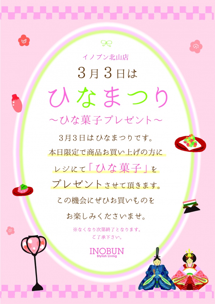 レジにて、ひな菓子をプレゼントさせていただきます♬
