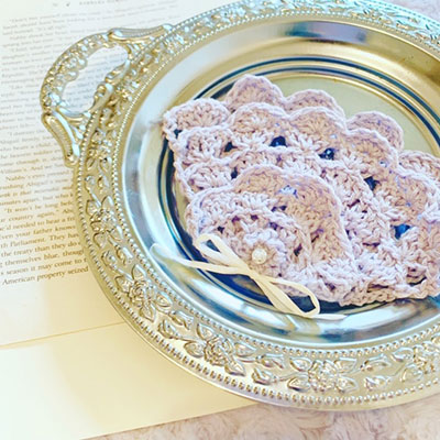 by.MERRYかぎ針編みで編む貝殻の形をした コースターセットです。 (コースター2枚+箸置き1枚) お使い慣れたかぎ針がありましたら ご持参下さい。《かぎ針6号》
