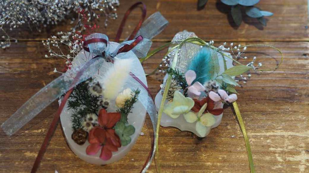 どれもとても素敵ですね。 クリスマスのオーナメントにしたりお部屋に飾ったりされるようです。 講師の坂東さんとたのしくお話しながら、たくさんすばらしい作品ができあがりました。 その素敵な空間を見ているだけで私も癒やされて、ワークショップに参加したくなりました!!
