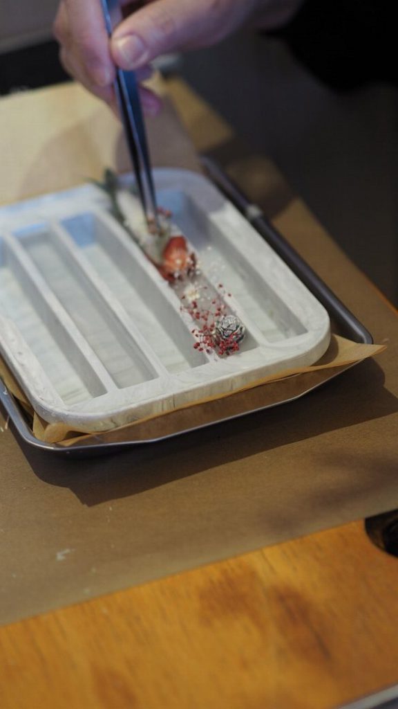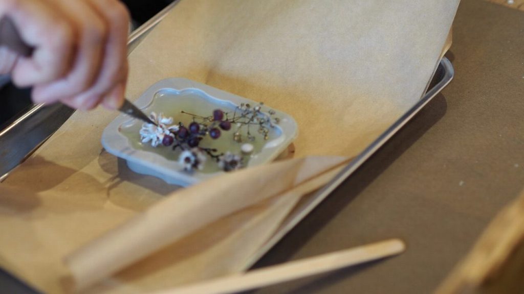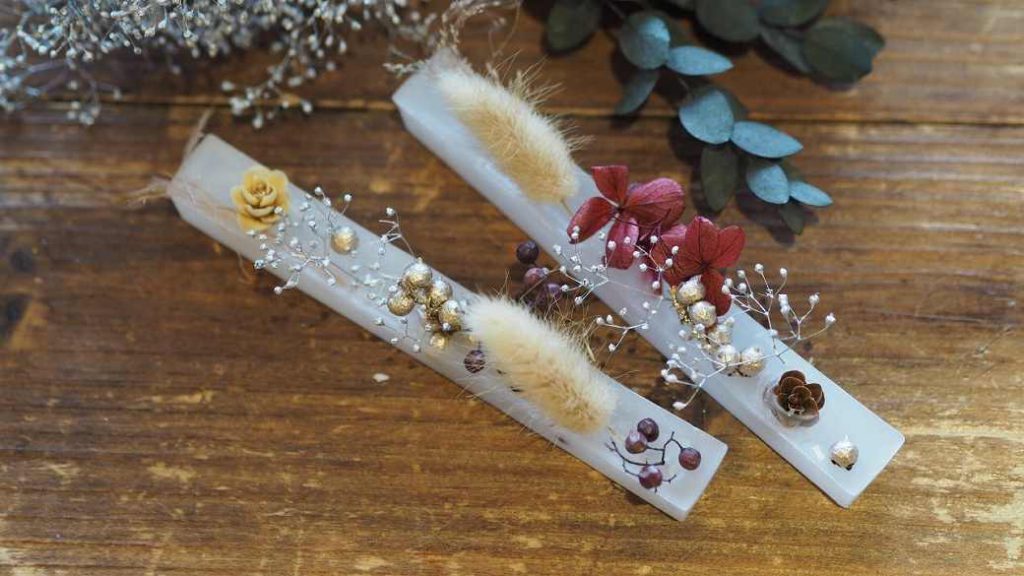 型に溶かしたワックスを流し込み、お好きなプリザーブドフラワーを置いて、ワックスが冷えてしっかり固まったら完成♪ お子様でも溶かしたワックスに気をつければとても簡単に可愛くおしゃれにできあがります!