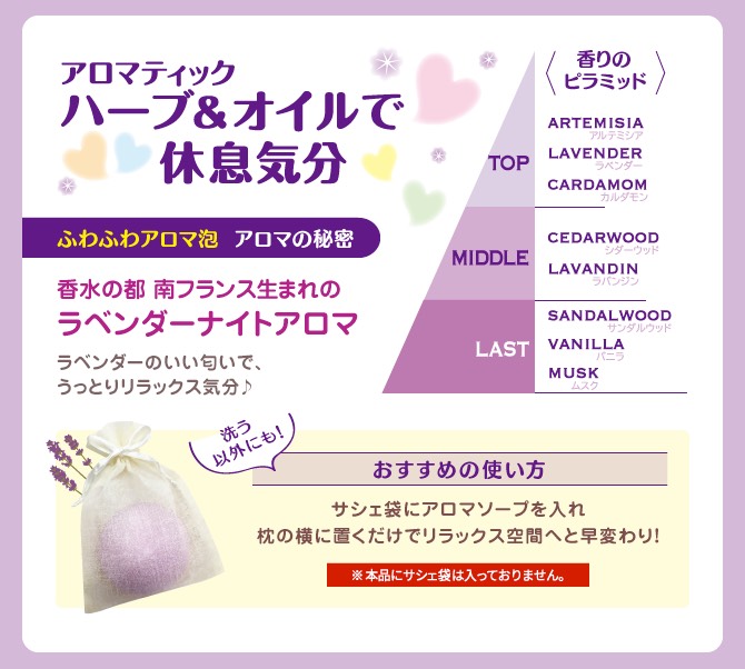 全身タイプのスヤスヤソープは、 南フランス生まれのラベンダーアロマを使用。 ラベンダーのいい匂いで心もカラダもリラックスできます。