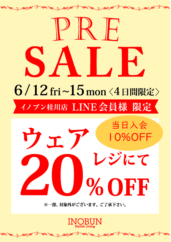 イノブン久御山店では、メール・LINE会員様限定で、6月12日(金)から15日(月)までの4日間、店内お洋服がひと足お先に、なんと20%オフ!!(プレSALEの配信が届いた方が対象です)