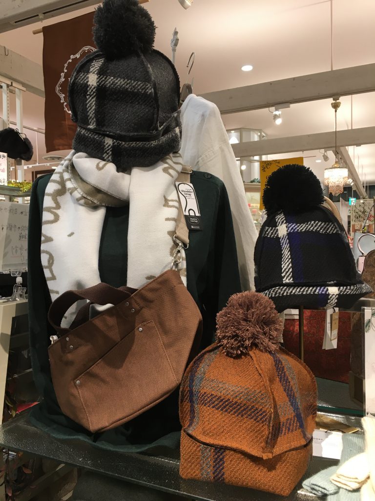 シーズンにぴったりなチェック柄のポンポンつきニット帽