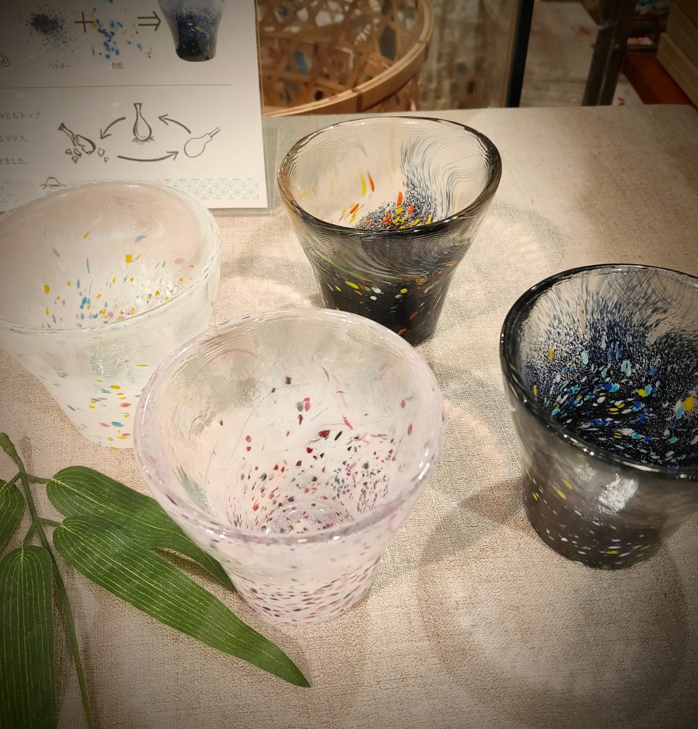 色粉と呼ばれる(パウダー)をまぶして色づけしているところがトミガラスの特徴です。 遠心力で硝子のたねを伸ばして作る「スピン製法」により美しい模様が全体に広がり、とても美しい表現が生まれます。