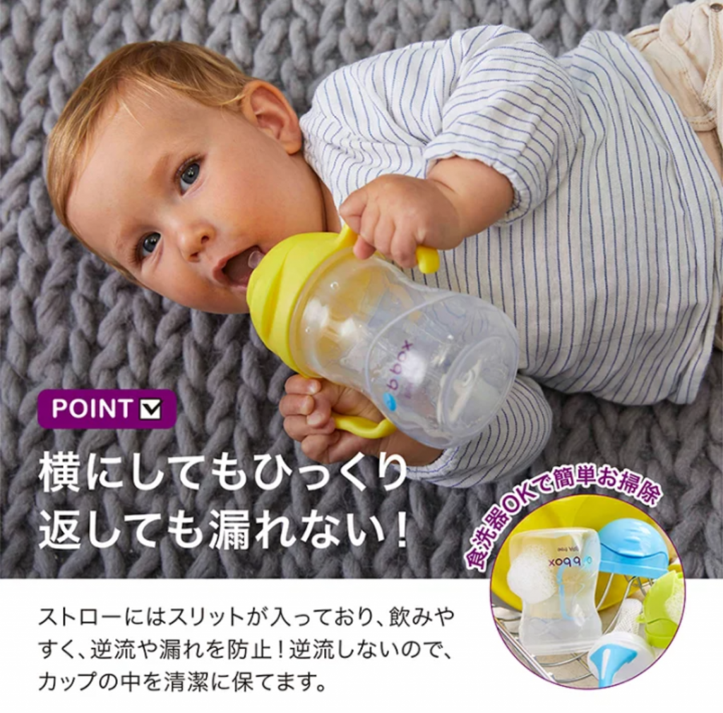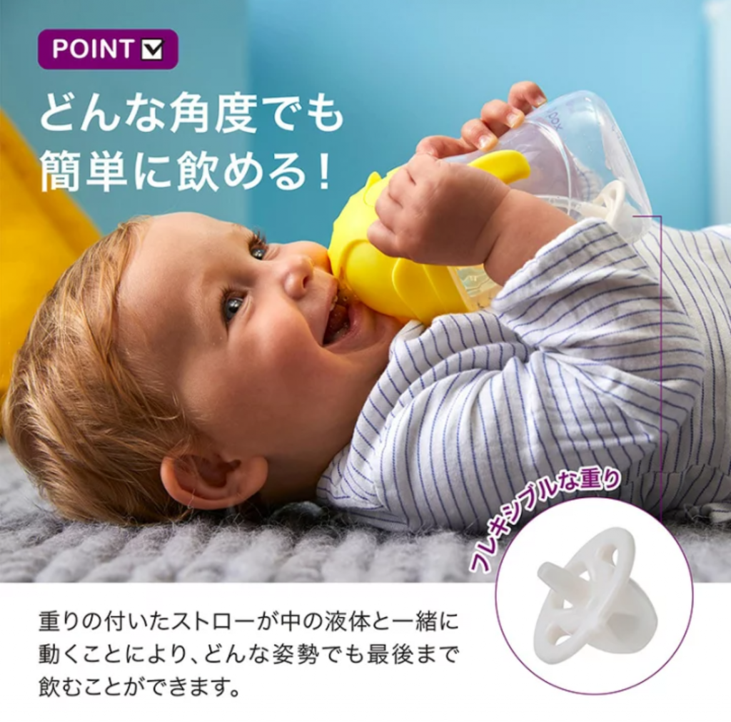 赤ちゃんが握りやすく飲みやすい設計で重りの付いたストローが中の液体と一緒に動くのでどんな姿勢でも最後まで飲むことができます。