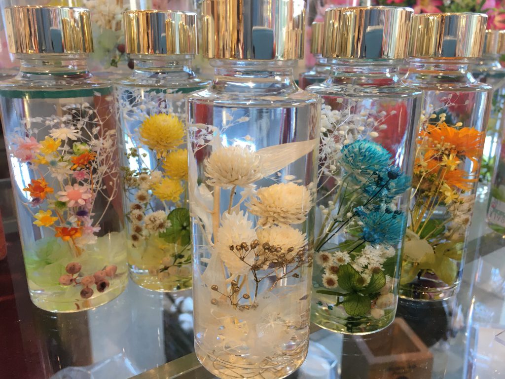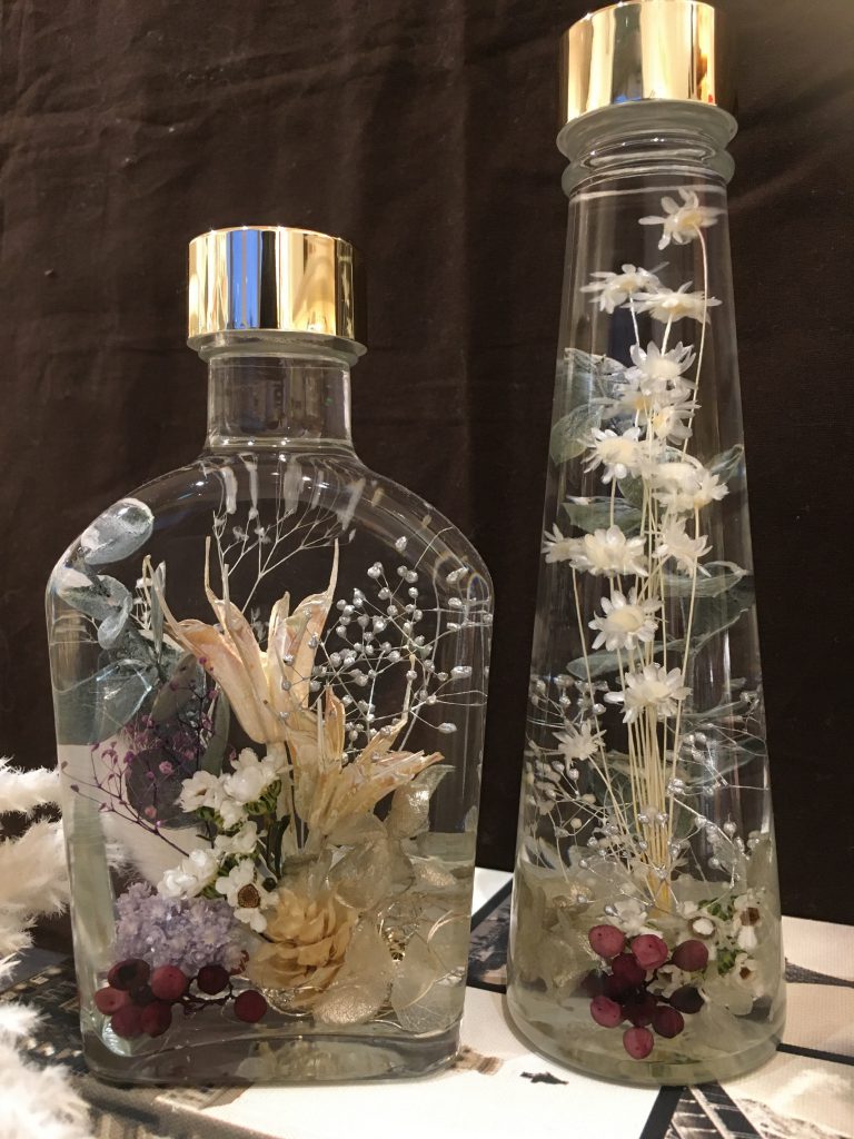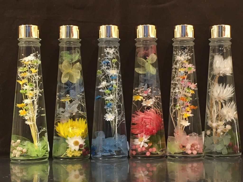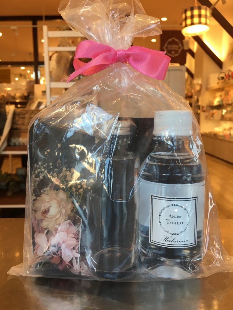 こちらはボトルにオイルとお花を入れるだけで簡単に作れるハーバリウムのキットです