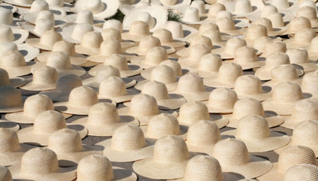 爽やかブルーの個性派ワンピースは、かごBAGやカンカン帽と相性ぴったり!