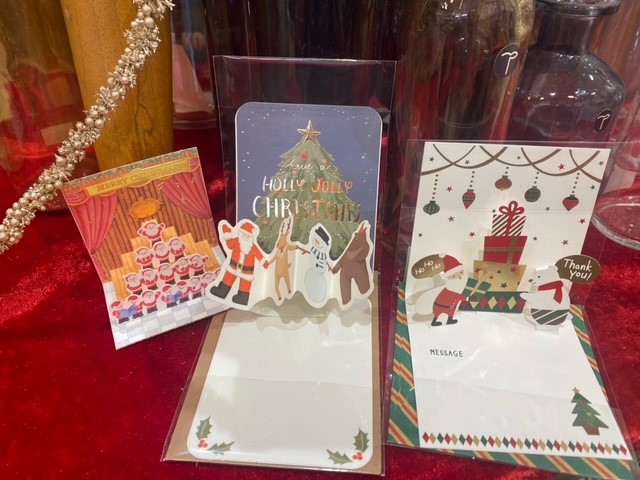 カードを開けると、絵が立体的に飛び出すポップアップカードは、お子様に人気でサンタクロースやツリー、トナカイなどがデザインされて見てるだけでワクワクしますね✴︎