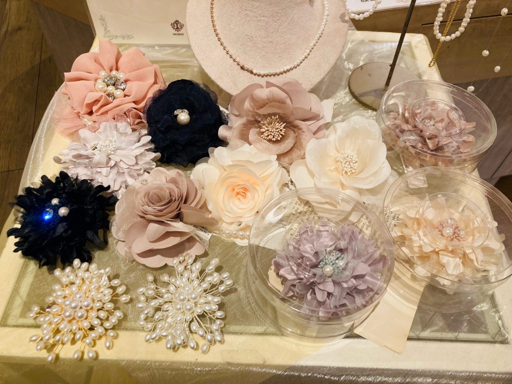 どんなお洋服の色味やデザインにも合わせやすい形のコサージュが入荷しております(*^^*)