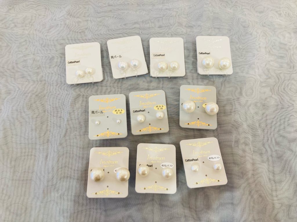 貝パール、コットンパール、ノンキャッチピアス、樹脂ポスト、18kポスト、あります♪