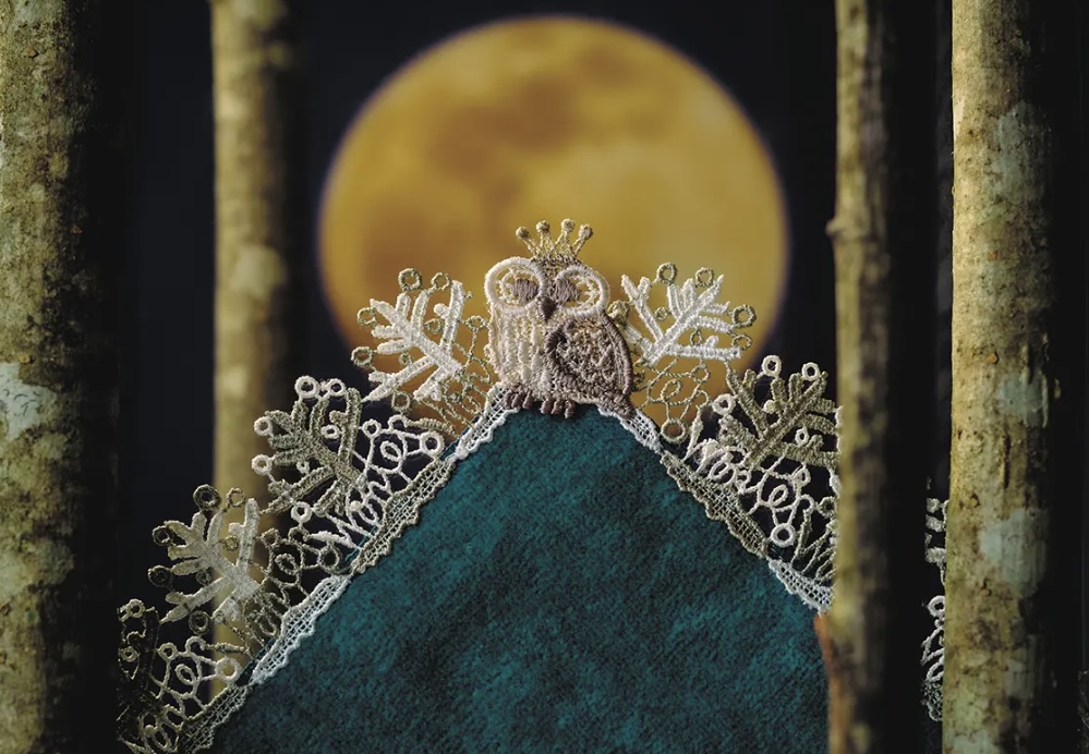 秋を飛ばして一気に冬のタイトルがついています。レースには雪化粧をした木々とwinter(冬)の文字が表現されていて梟がより洗練されて見えます。