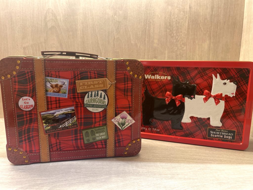 エンボス加工がされているオシャレなスーツケース缶や2匹の愛らしいスコッティドッグ缶、クリスマス限定のフェスティブシェイプのショートブレッドなど、、見た目も可愛いので贈り物にもぴったりなお菓子です♪