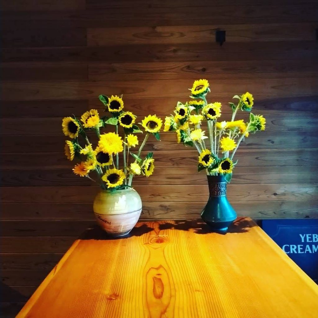 花瓶におひとり様1本づつ挿して、完成したあとはぜひ記念写真をお取りください(^^)参加された方へはミニひまわりをプレゼントいたします♪