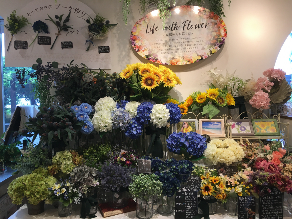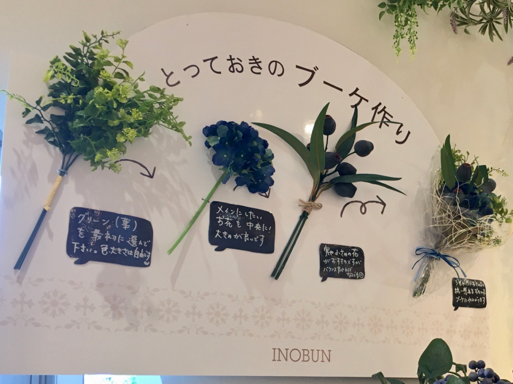 今はブルー系とひまわりの造花で涼しげな印象です壁際には”ブーケ作り”の大きなポップを飾っています