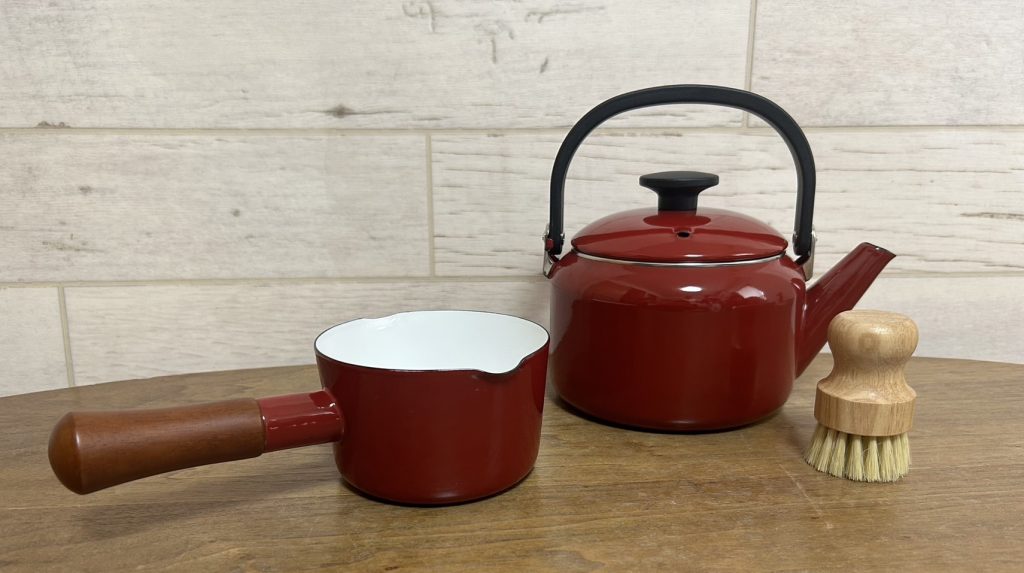 お料理に大活躍する富士琺瑯の赤色のミルクパン・ケトル・ブラシの