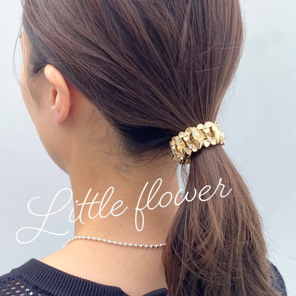ヘアゴムだけの状態より、1つアイテムを加えることでぐっとおしゃれになるので、とてもオススメです。華やかなので特別な日にも。