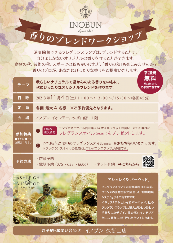 イノブン久御山店でも、大人気の アシュレーバーウッドのフレグランスランプの専用の、オイルランプのブレンドワークショップです。
