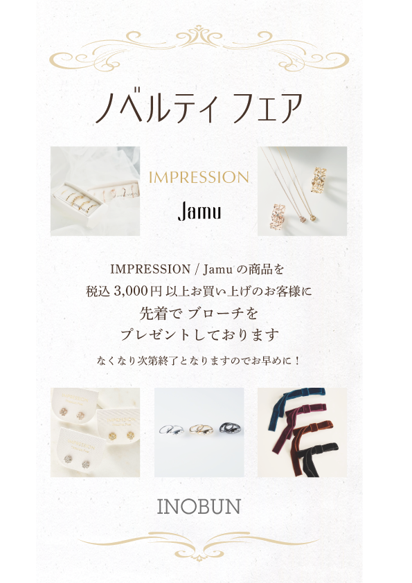 本日より、対象アクセサリー合計¥3,000ご購入でブローチプレゼントのフェアをスタートいたします♪