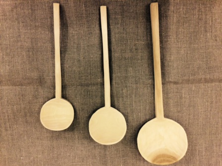 短く切った丸太をノコギリやナタで大裁ち、なたで木杓子の大まかな形を作り出します。