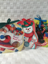 サンタ、スノーマン、キャットのクリスマスらしい絵柄が楽しいバスギフト!入浴品3点とバブルバス1点が入っています!