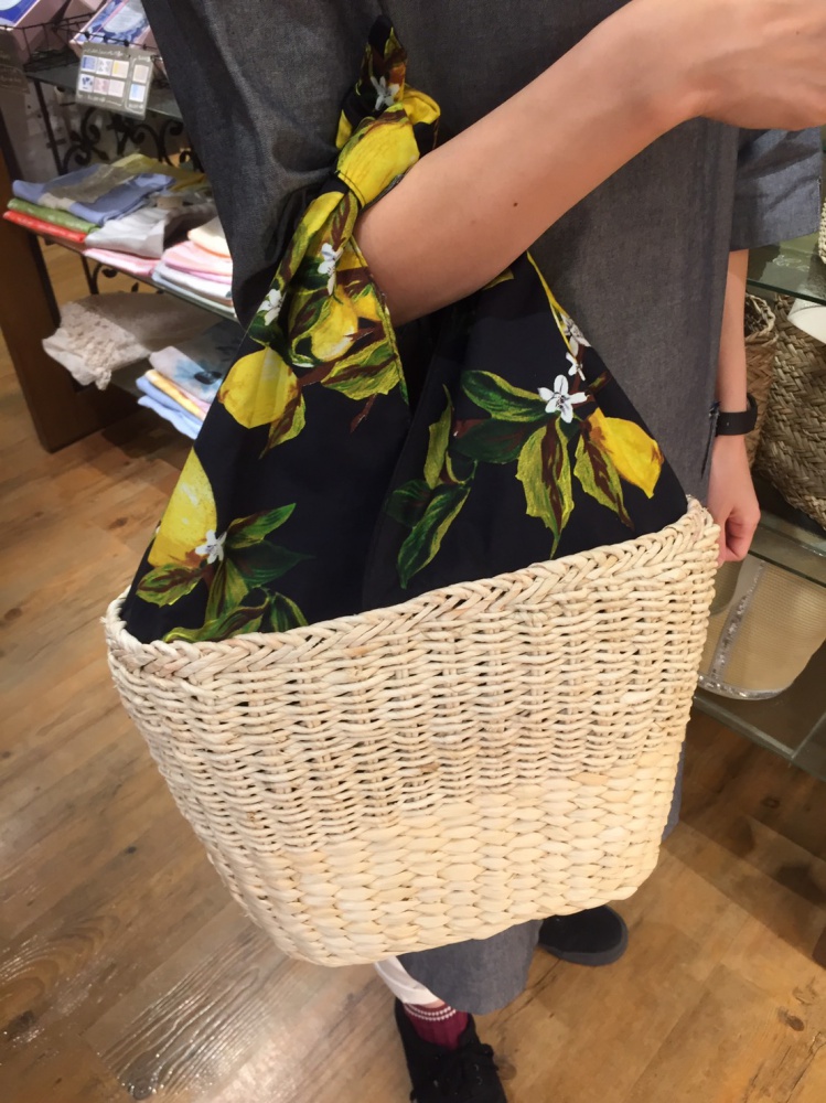 レモン柄がかわいいカゴバッグ。 持ち手はレモン柄の布を結んで調整します。 夏にぴったりのカゴバッグです。