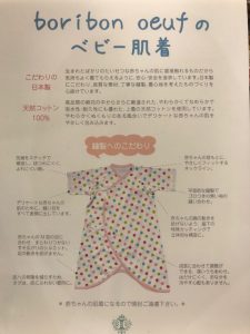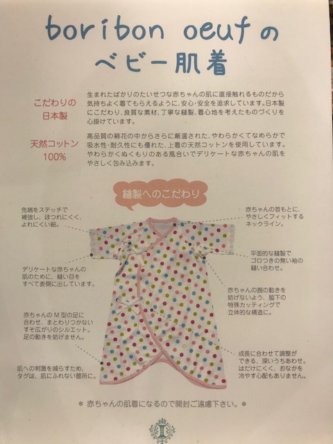 *こだわりの縫製* ・デリケートな赤ちゃんの肌のために 縫い目を全て表側に出しています。 ・赤ちゃんの腕の動きを妨げないよう 脇下の特殊カッティングで立体的な構造に。 ・赤ちゃんのM字の足に合わせ まとわりつかないすそ広がりの シルエットで足の動きを妨げません。 ・股にはボタンが付いているので 1枚で着れます。 赤ちゃんに気持ちよく着てもらえる ように素材や縫製、着心地を 考えられて作られている肌着。 ご自宅用やギフトにいかがですか? 皆さまのご来店を心よりお待ちしております。