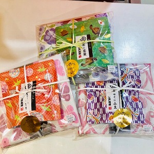 白雪ふきんと粋町ショコラのギフト。色々な柄が可愛い白雪ふきんは、何枚あっても便利!美味しいチョコレートとのセットで喜ばれること間違いなしです^ ^