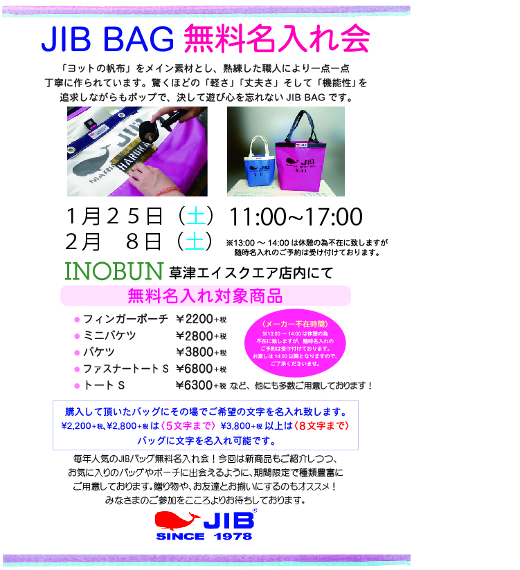 ☆JIBバッグ無料名入れ会☆