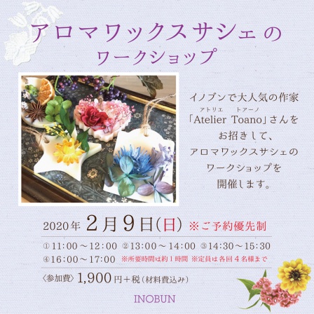 イノブンで大人気の作家「Atelier Toano」さんをお招きして、アロマワックスサシェのワークショップを開催します。