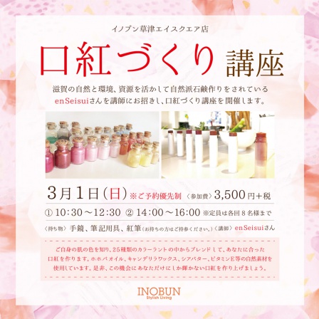 滋賀の自然と環境、資源を活かして自然派石鹸作りをされているenSeisuiさんを講師にお招きして、口紅づくり講座を開催します。