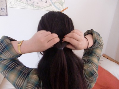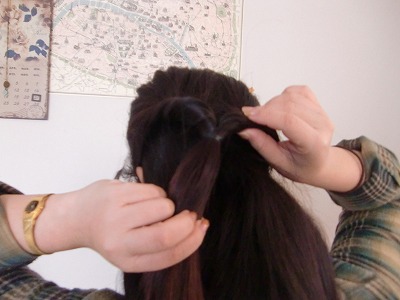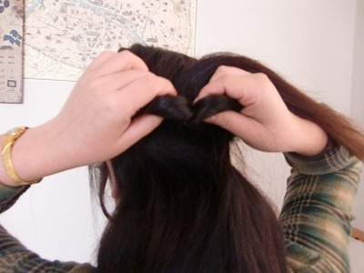 次に結んだトップの毛にわっかを作り、そこに髪の毛を通してくるんと一回転させます。