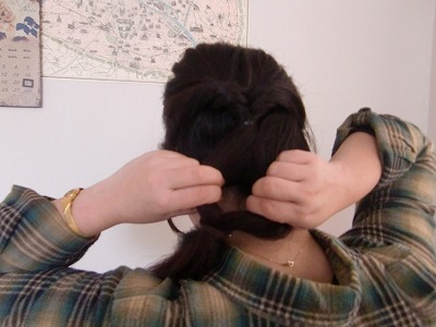 これも先ほどと同じようにわっかを作り、そこに毛束を通してギュッとしばります。