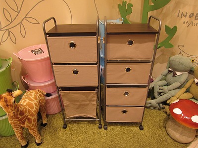 写真左のチェストは、下の部分がランドリータイプになっているので洗濯物を入れるのに最適♪上の部分にはタオルなどを入れておけばとてもスッキリ収納できます