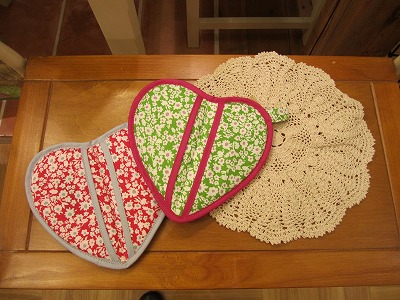 かわいいハート型のポットホルダーは指を差しこむだけのシンプルなデザイン。かわいいので飾っておくだけでもいいですね。