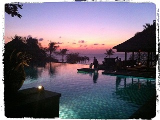 プールのブルーと空一面むらさきの夕日がマッチしてとってもキレイでした☆